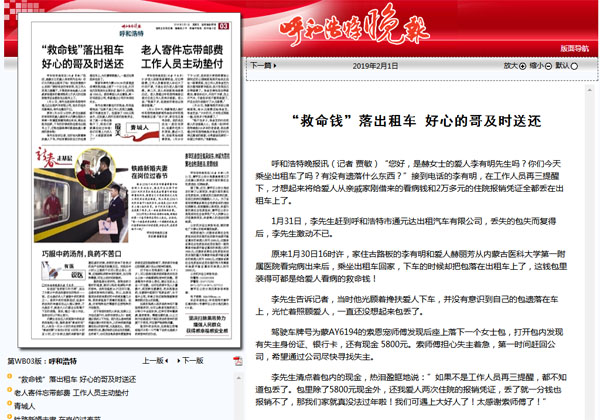 ”救命錢”落出租車 首府好心的哥及時送還 |