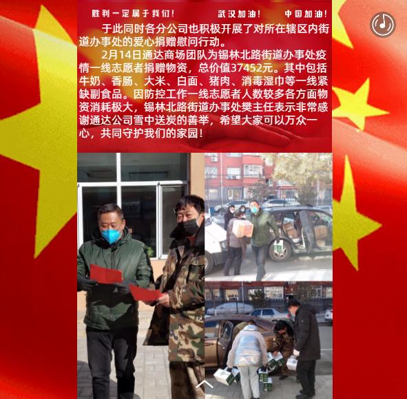 在新型冠狀病毒肺炎疫情肆虐神州大地之時,在這個特殊的時期里,每個人都卷入了一場特殊的戰(zhàn)役。在疫情當(dāng)前我們看到一批批勇敢的逆行者夜以繼日的堅守在一線崗位,保障著你我健康安全,守護者大家的生活秩序。內(nèi)蒙古通達實業(yè)股份有限公司強化責(zé)任擔(dān)當(dāng)、積極響應(yīng)、迅速行動,在做好各項防控措施的同時出資20萬元善款,通過全市多個轄區(qū)內(nèi)的街道辦事處進行愛心物資捐贈活動,以表達通達公司對奮戰(zhàn)在疫情聯(lián)防聯(lián)控一線的工作人員最崇高的敬意!