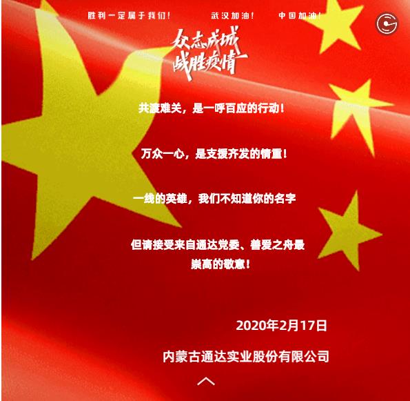 內(nèi)蒙古通達實業(yè)股份有限公司在此次新型冠狀病毒肺炎疫情期間共對接7個政府部門進行愛心物資專項捐贈活動,為在防控疫情一線的志愿者們累計捐贈20萬元。