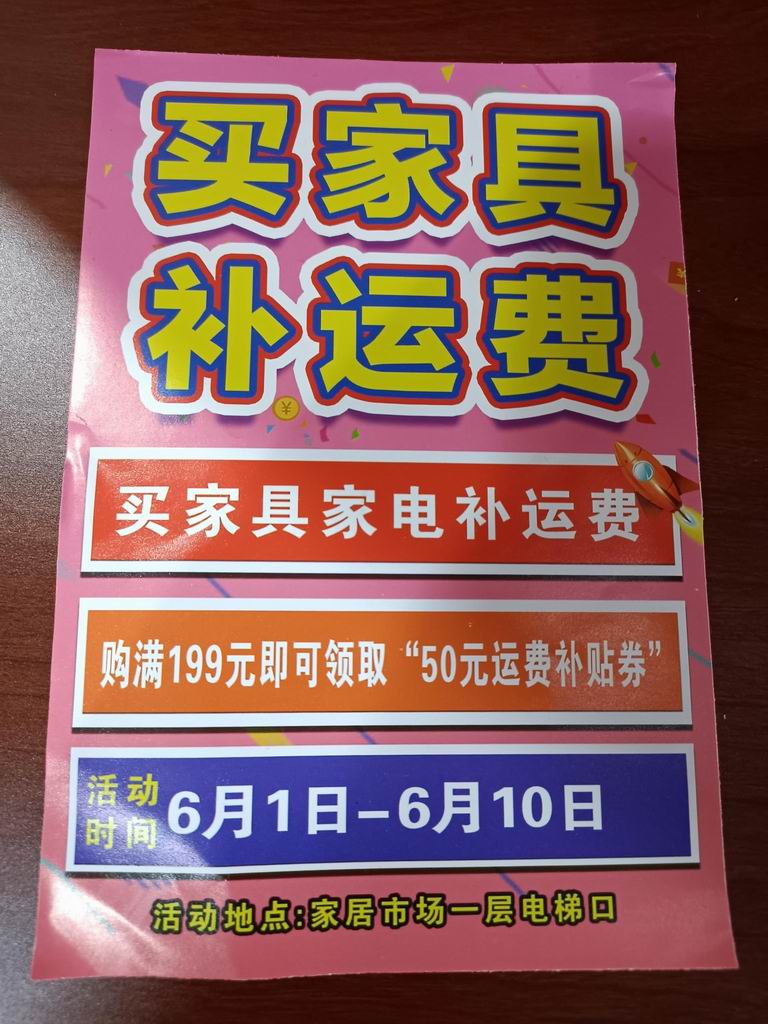 南站家居市場(chǎng)端午節(jié)促銷活動(dòng),從6日1日至10日,本著回饋消費(fèi)者,提升商戶銷售量,烘托購(gòu)物氣氛,買家具補(bǔ)運(yùn)費(fèi),來(lái)吸引消費(fèi)者,家具市場(chǎng)從6月11日開(kāi)始至13日,進(jìn)行補(bǔ)運(yùn)費(fèi)領(lǐng)現(xiàn)金活動(dòng),商戶,消費(fèi)者對(duì)本次促銷形式滿意,本次活動(dòng)即增加了商戶銷售額,又提升了市場(chǎng)知名度。